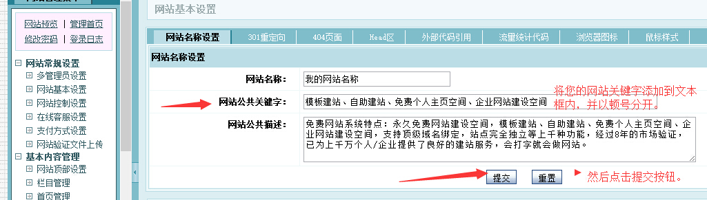 首先要进入您的网站后台,点击网站基本设置》网站基本名称》网站公共描述