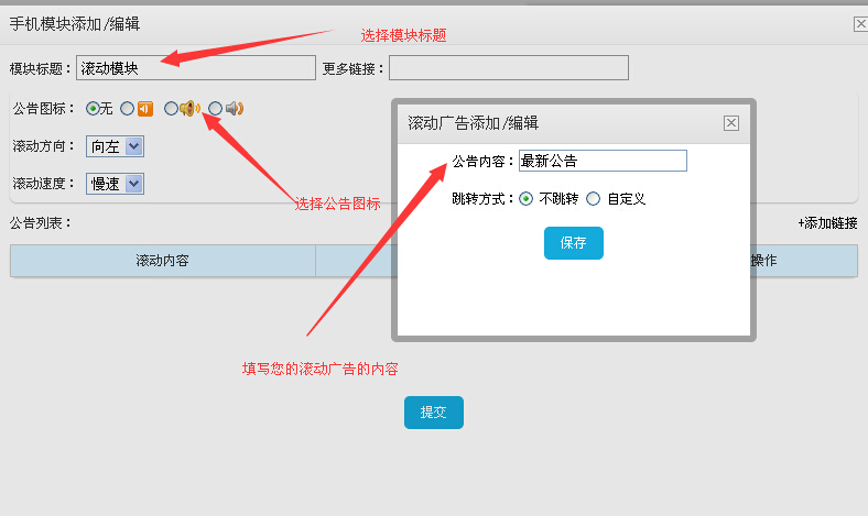 首先,您进入手机后台管理中心,在左侧中添加模块 》选择滚动信息